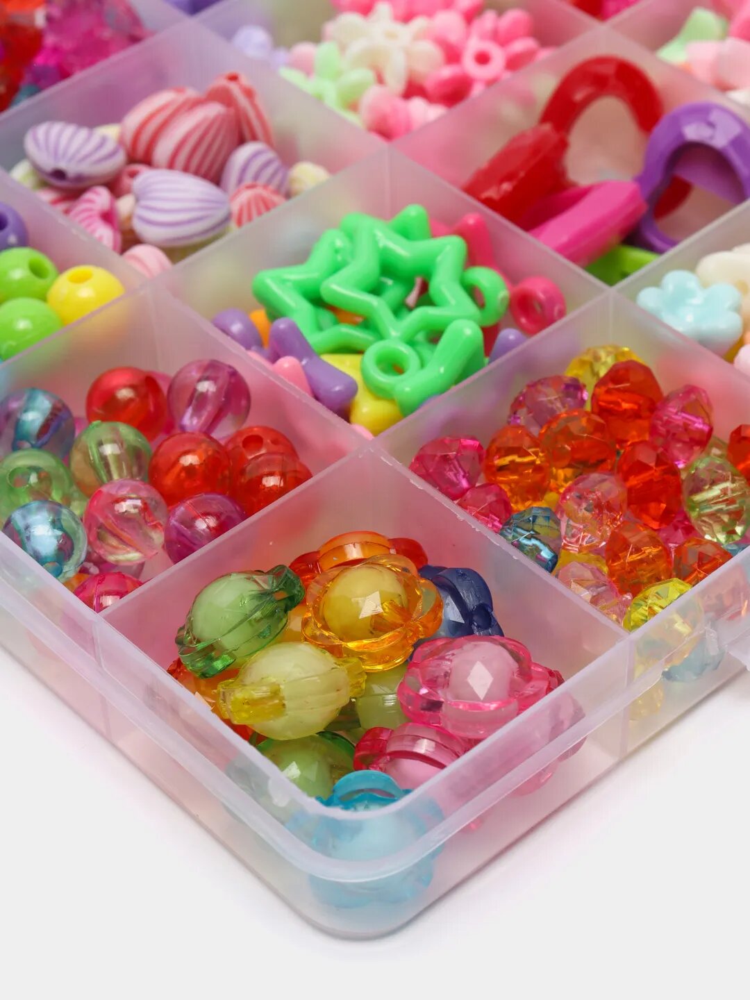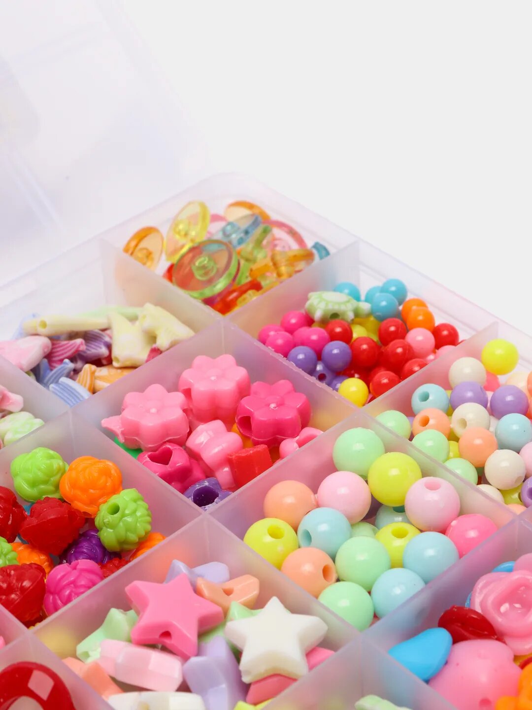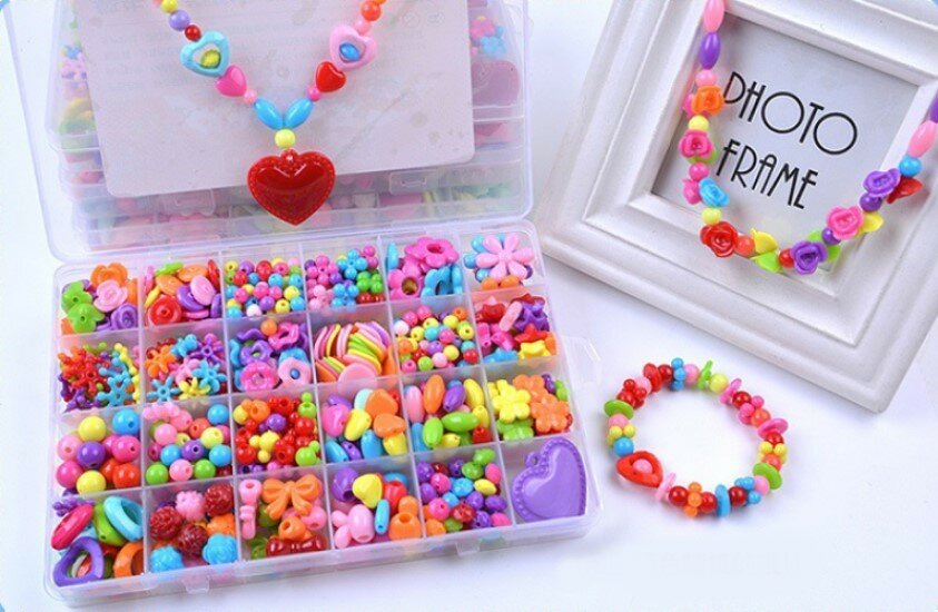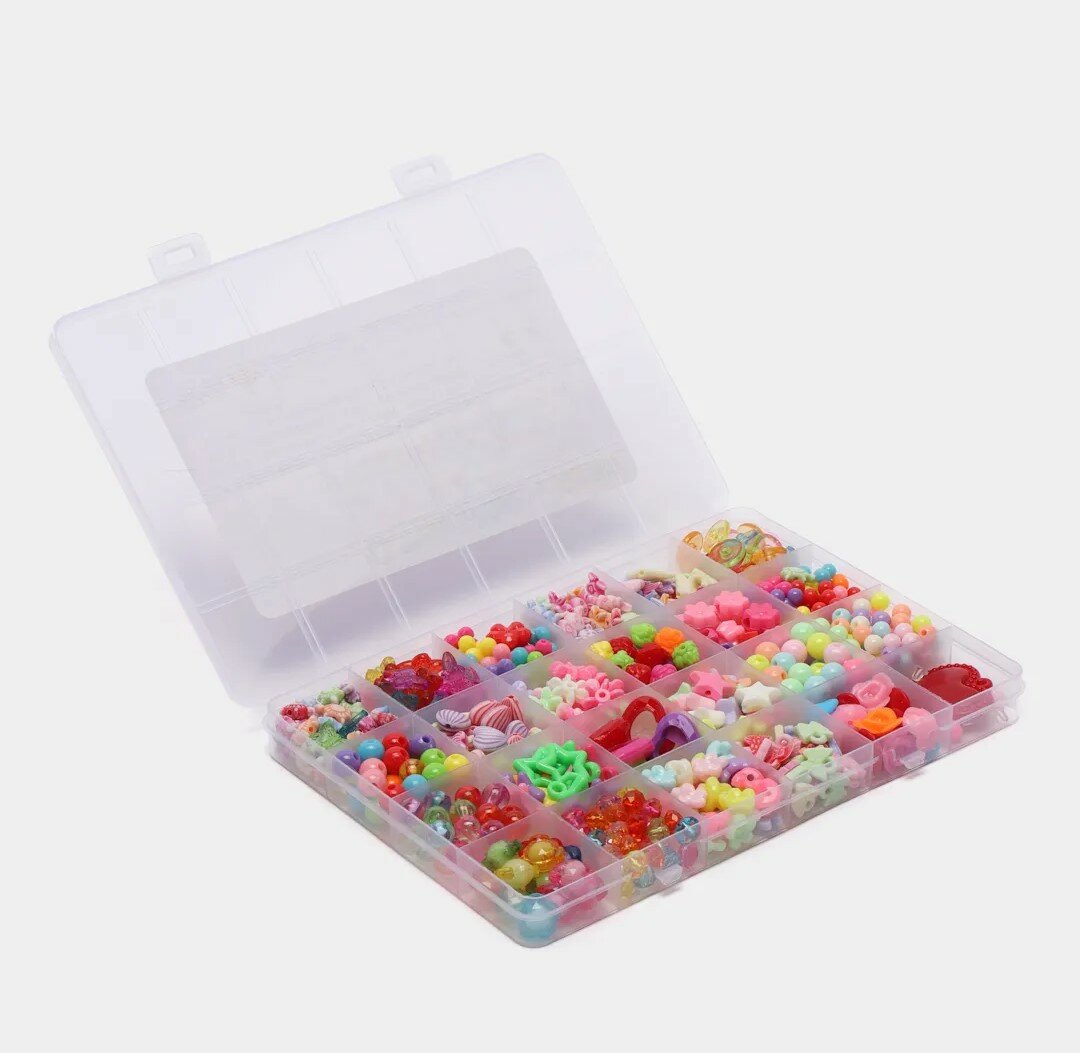 Набор для создания украшений включает 24 вида бусин, которые отличаются формой и оттенком. Разнообразие дизайна позволит с легкостью импровизировать и развивать фантазию, создавать своими руками браслет, ожерелье, кольцо, ободок, серьги и другое. Детский набор для творчества способствует развитию логического мышления, мелкой моторики рук. Аксессуары хранятся в удобной пластиковой коробке, которую удобно брать с собой в дорогу, на отдых, пикник, творческие мероприятия. Пластиковая коробка защитит изделия от внешних негативных факторов, в том числе намокания. Также набор можно купить для увлекательных занятий дома, плетение. В наборе для создания украшений около 500 элементов: звезды, бабочки, фрукты, цветы, шарики, бантики, буквы, кристаллы, зайчики, рыбки, сердце, кристаллы,камни, смайлики, которые удобно распределены в боксе.Все изделия, входящие в комплект, имеют правильную форму, выполнены из безопасных материалов и окрашены в яркие цвета, благоприятно воздействующие на эмоциональный фон девочек. Набор для рукоделия - прекрасный вариант подарка для девочки, подруги на праздник, на день рождения.