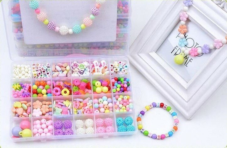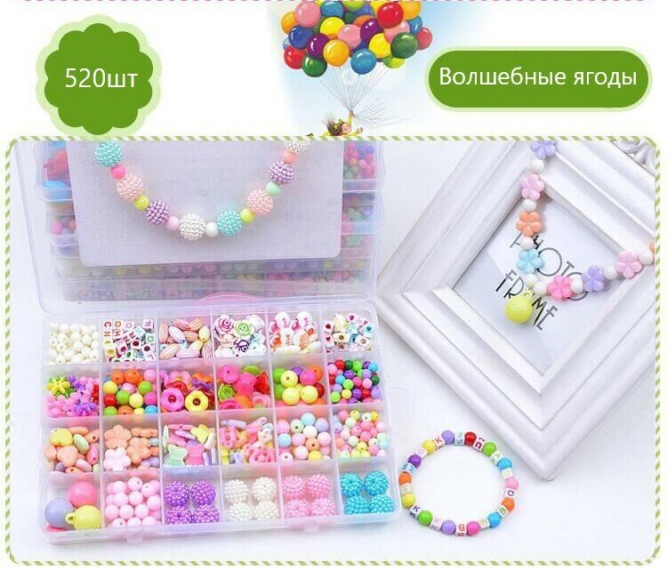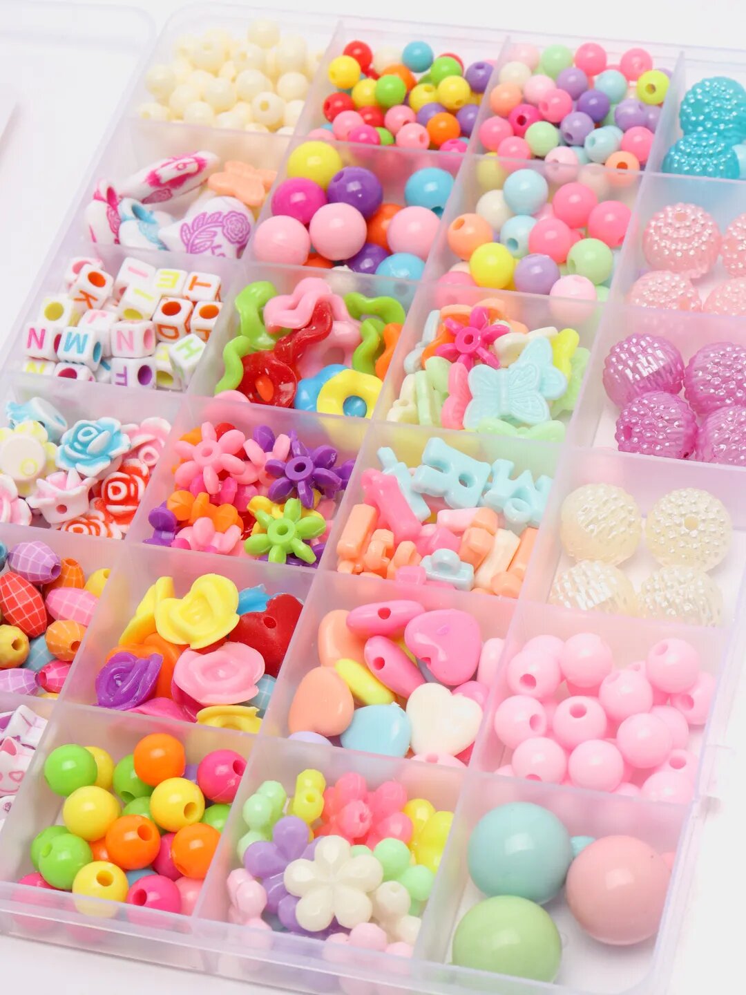 Набор для создания украшений включает 24 вида бусин, которые отличаются формой и оттенком. Разнообразие дизайна позволит с легкостью импровизировать и развивать фантазию, создавать своими руками браслет, ожерелье, кольцо, ободок, серьги и другое. Детский набор для творчества способствует развитию логического мышления, мелкой моторики рук. Аксессуары хранятся в удобной пластиковой коробке, которую удобно брать с собой в дорогу, на отдых, пикник, творческие мероприятия. Пластиковая коробка защитит изделия от внешних негативных факторов, в том числе намокания. Также набор можно купить для увлекательных занятий дома, плетение. В наборе для создания украшений около 520 элементов: звезды, бабочки, фрукты, цветы, шарики, бантики, буквы, кристаллы, зайчики, рыбки, сердце, кристаллы,камни, смайлики, которые удобно распределены в боксе.Все изделия, входящие в комплект, имеют правильную форму, выполнены из безопасных материалов и окрашены в яркие цвета, благоприятно воздействующие на эмоциональный фон девочек. Набор для рукоделия - прекрасный вариант подарка для девочки, подруги на праздник, на день рождения.