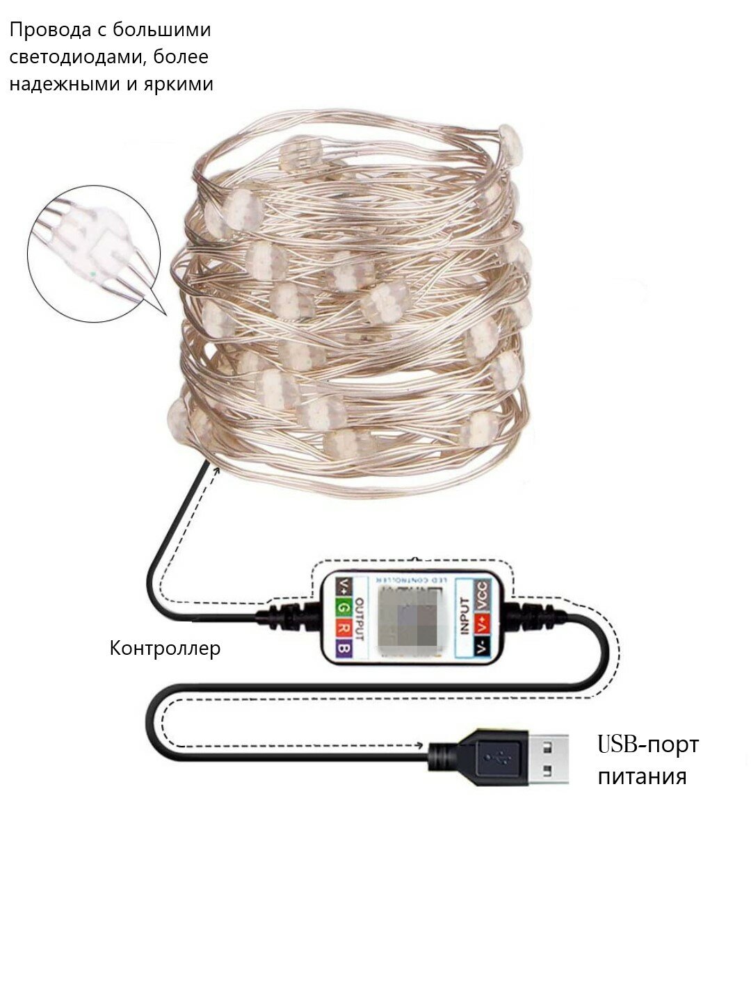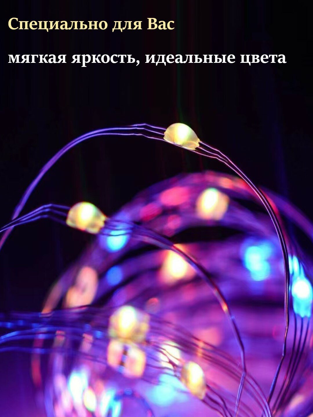 Самая современная трендовая и очень красивая гирлянда роса на гибкой проволоке, синхронизация с музыкой, питание через USB зарядное устройство смартфонов, планшетов и т.д., POWER BANK, ноутбук, батарейки не требуются. Очень простое и многофункциональное управление через приложение в мобильном телефоне LED LAMP (можете скачать в GOOGLE PLAY или отсканировать QR-код в прилагаемой инструкции). Загрузите приложение "LED LAMP” и включите блютуз для синхронизации и наслаждайтесь огоньками под ваше настроение или музыку. Дистанционное управление не требуется. Можно изменять цвет более 16 миллионов цветов, доступны 7 сюжетных режимов и 29 динамических режимов. Даже если Bluetooth не подключен, функция памяти может продолжать работать, а настройка таймера также имеет функцию памяти. Светодиодная многоцветная лента RGB с контроллером создаст праздник в вашем доме! Благодаря незаметности и гибкости провода гирлянда может оплетаться вокруг цветов (цветочная гирлянда), ваз, винных бутылок, предметов интерьера, а также создавать различные фигуры и формы (сердце) - лучший декор. Также гирлянда хорошо смотрится на новогодней елке с елочными игрушками, в рождественских декорациях из еловых веток. Это просто находка для блогеров и людей, которым нравится создавать красивые фотографии и уютную обстановку.