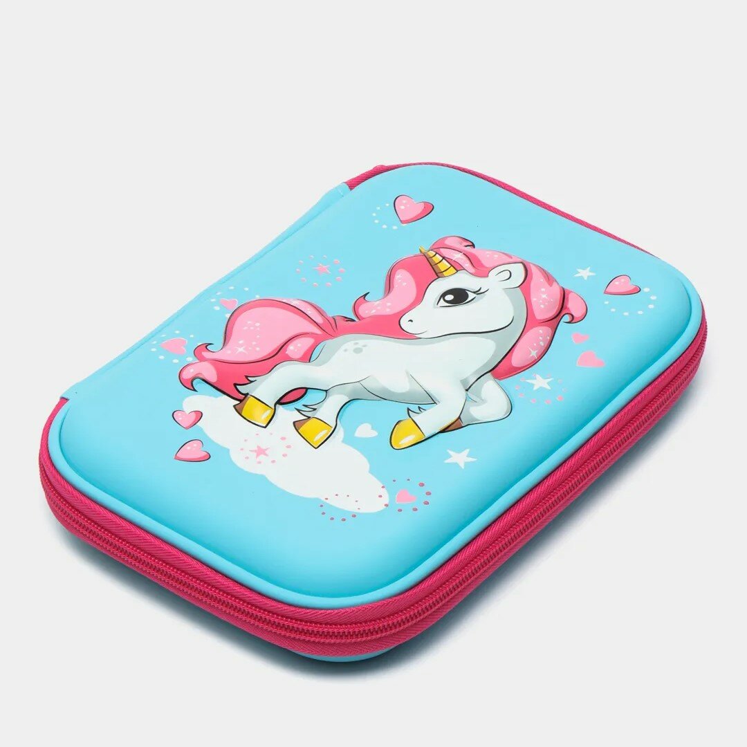 Пенал Единорог школьный в школу для девочек с 3д рисунком на молнии, голубой