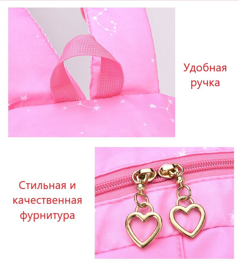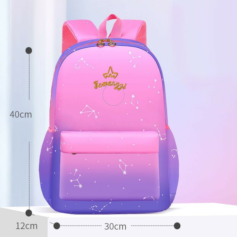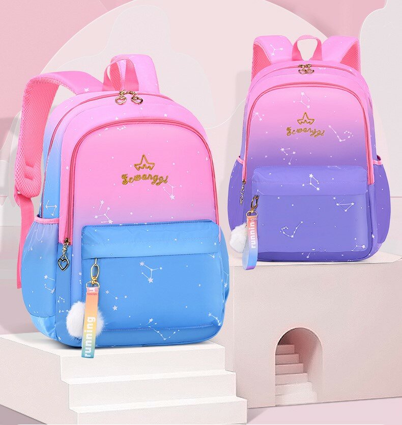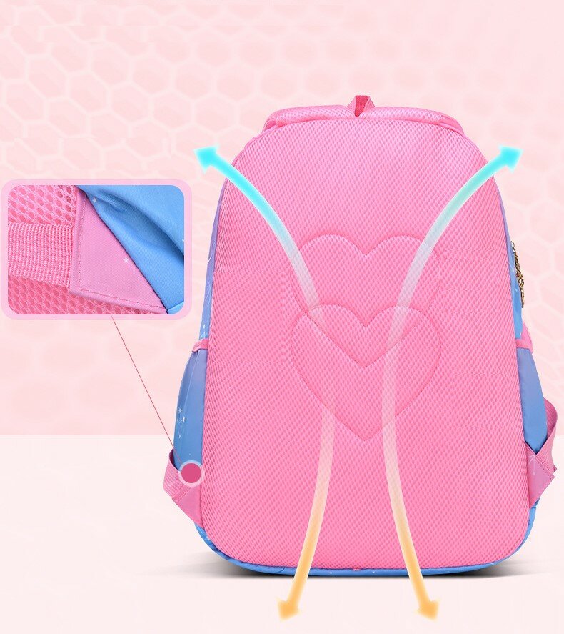 Рюкзак школьный для девочек в розово-голубом и розово-сиреневом цветах. В розово-голубом цвете 2 отдельных отделения на молнии. В розово-сиреневом цвете одно отделение. Также в каждом рюкзаке есть большой передний карман на молнии для канцелярии или мелочей. По бокам этого ранца расположены 2 удобных кармана для бутылок. Внутри основного отделения есть небольшой отсек. Спинка плотная, достаточно жесткая и "дышащая" благодаря сетчатому внешнему материалу. А регулируемые лямки имеют анатомическую изогнутую форму и удобно сидят на плечах. Материал водоотталкивающий, а рисунок очень яркий, сочный, не выцветает на солнце. Он подойдет для первоклассницы, или для ученицы средних классов, а также как рюкзак для девочек подростков постарше. С ним можно ходить и на внешкольные занятия, например в бассейн, на гимнастику, на танцы.