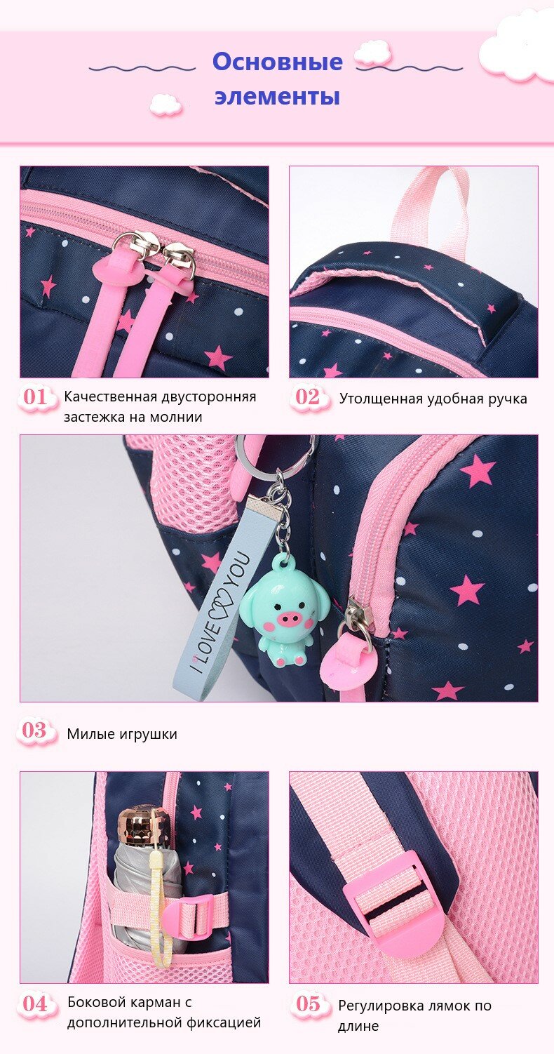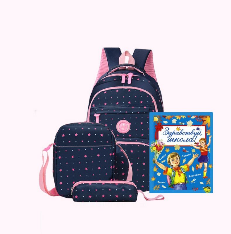 Универсальный школьный рюкзак для девочек 3 в 1. Основное отделение помещается книги, тетради, альбомы, журналы, а также других складных материалов стандартного размера. Всего 3 отделения. Все отделения и кармашки на молнии. Рюкзак широко открывается, обеспечивая легкий доступ к содержимому. Сверху рюкзака имеется удобные 2 ручки для переноски. По бокам имеется вместительные карманы для бутылок. Лямки мягкие, регулируются по длине. К рюкзаку прилагается сумка через плечо и пенал. Пенал и сумка закрывается на молнию. Сумка достаточно вместительная , имеется основное отделение и карман на молний.